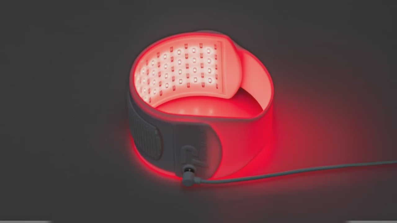 Salus red light therapy device applied to wrist for pain relief and recovery. It uses 660nm and 880nm near infrared light.